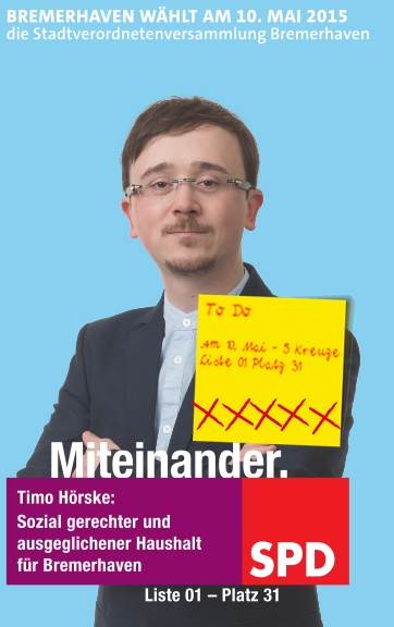 Als Wahlbremerhavener könnt Ihr eure fünf Kreuze bei mir machen. Seit 10 Jahren lebe ich mittlerweile hier und habe mich damals bewusst dafür entschieden, hier Leben zu wollen. Diese Entscheidung habe ich bisher nicht bereut. Bremerhaven hat seinen Reiz für mich nicht verloren. Immer noch kann ich Neues entdecken und Altes lieben. Zugezogen fühlt man glaube ich anders für seinen Wohnort, als wenn man dort aufgewachsen ist. Dies sehe ich immer als Chance alte eingefahrene Sichtweisen aufbrechen zu können. Für den schönen Stadtteil Mitte ziehe ich in den Wahlkampf. Ich möchte unsere Seestadt in seinem positiven Wandel bestärken und noch lebenswerter gestalten. Hierfür bedarf es einer soliden Finanzierung von kommunalen Pflichtaufgaben und das Verhindern weiterer Verschuldung. Alle Projekte sollten auf ihre Wirtschaftlichkeit hin überprüft und gewinnbringende stärker gefördert werden. Hierbei müssen Schwerpunkte auf die Entwicklung der Wirtschaft, des Tourismus und der Wohlfahrt gelegt werden. Es bedarf eines Ausbaus der Infrastruktur sowie der Attraktivität der Seestadt. Diese und weitere Schwerpunkte werde ich für Dich bei meiner Arbeit als Stadtverordneter verfolgen – wenn du mich mit Kreuzchen unterstützt!