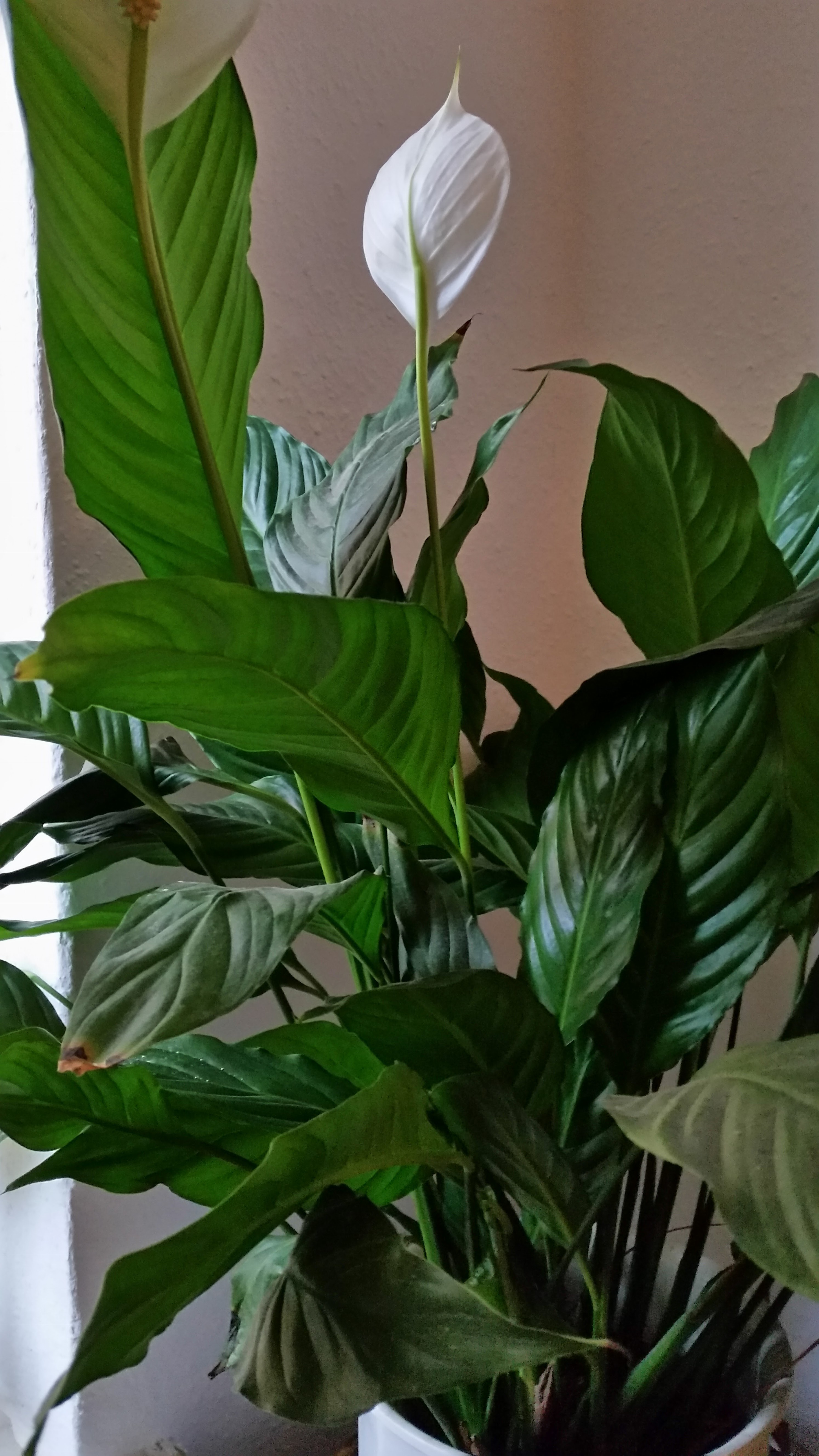 Als letztes möchte ich euch Spathiphyllum wallisii vorstellen, eine sehr unkomplizierte Pflanze aus Kolumbien mit lanzettähnlichen, bis zu 25cm langen Blättern und aronstabähnlichen Blüten mit hellem Spatha (Hochblatt), das den gesamten Blütenstand überragt. Während die Blüten nur wenige Tage offen sind, bleibt die Spatha mehrere Wochen erhalten und vergrünt dabei zusehens. Sie ist sehr gut für Zimmer- und Hydrokultur geeignet, da bei günstigen Temperatur- und Feuchtigkeitsverhältnissen keine Ruhepause benötigt wird.