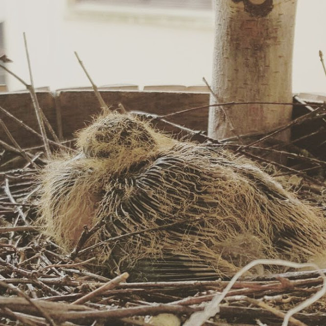 Die Türkentauben legen meistens 2 weiße Eier. Die Brutdauer beträgt ca. 14 Tage und so war es auch bei uns auch fast. Mutter war kurz weg und wir haben die Chance genutzt ein Bild zu machen.