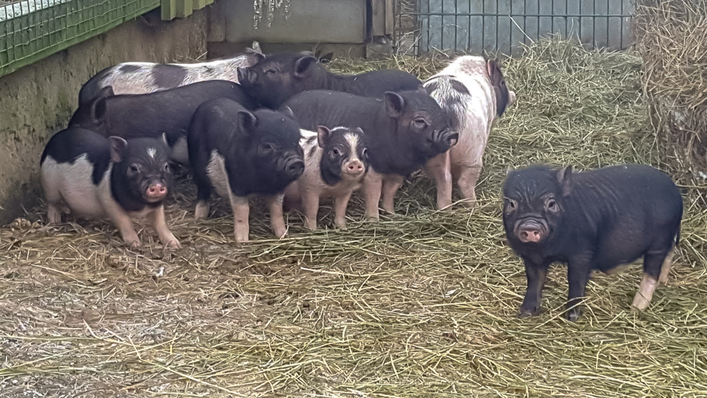 Bildnachweis: Sabrina CzakIm Einklang sitzen sie beieinander: Die Minnesota-Minischweine mit ihren Ferkeln, die schwarzen Schwäne mit ihrem flauschigen Nachwuchs, die Warzenente und die bunten Hühner. Gemeinsam fressen und picken sie auf, was ihnen die Besucher aus den bunten Plastikeimern servieren.